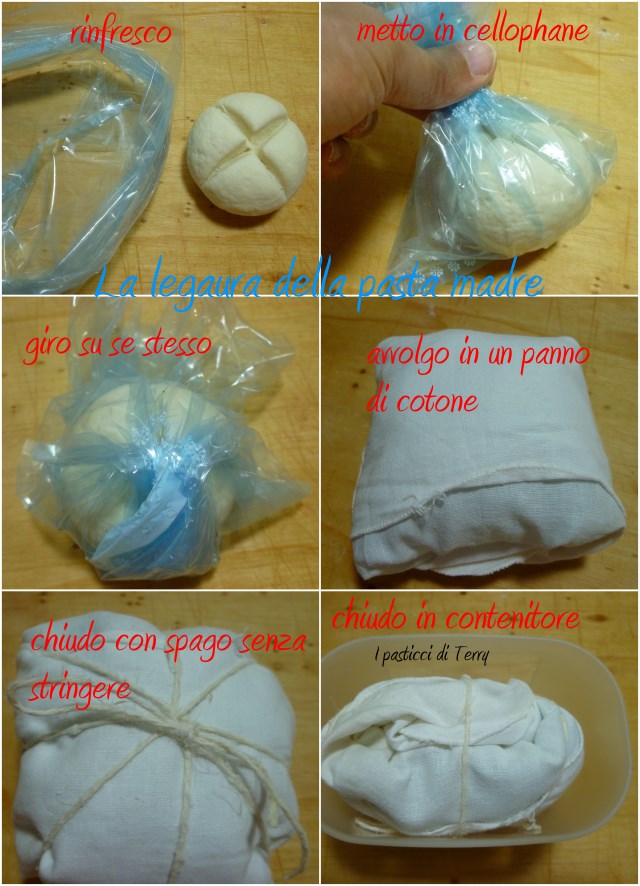 Ecco che allora io lo conservo in frigo, nella parte meno fredda, chiuso in un sacchetto, avvolto in un tovagliolo, chiuso in un contenitore a misura, di plastica, con il coperchio. Così ci mette di più a raffreddare. Quando poi lo devo utilizzare, lo lascio acclimatare, prima di rinfrescarlo. Io ne conservo circa 100 gr. Quando ho cominciato ne conservavo di più ma finivo per averne sempre di avanzo in grandi quantità e quindi da quest’anno ne conservo circa 100 gr o poco più. Non vale la pena buttare e sprecare farina.