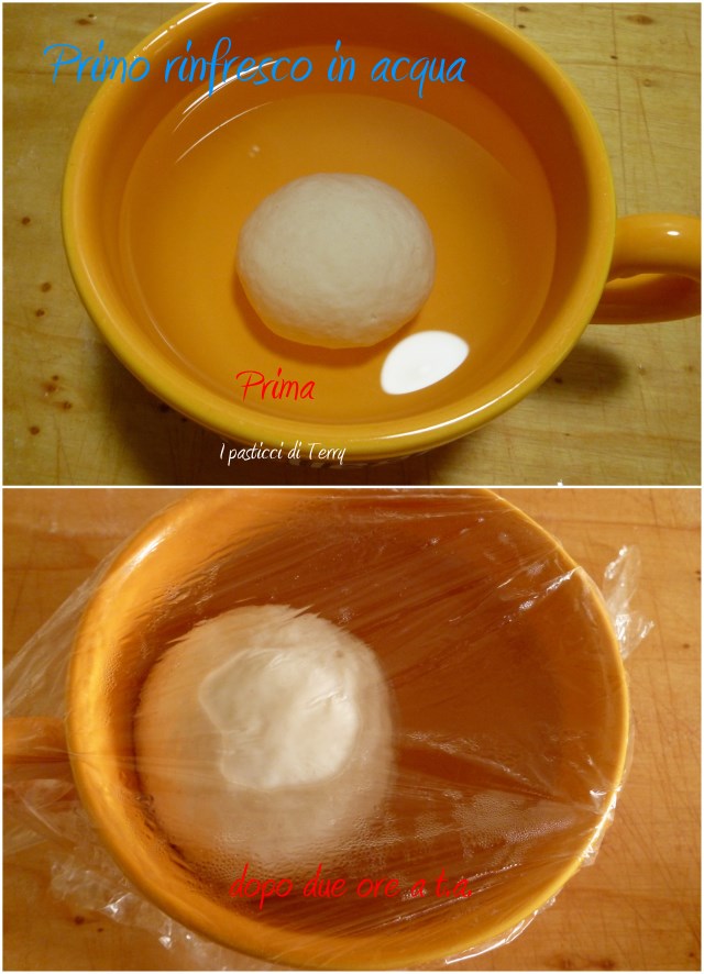 Se invece devo preparare un Panettone o un altro grande lievitato, la lego la sera e la lascio a temperatura ambiente, tutta la notte. Al mattino ne prelevo solo 30 grammi, sempre dal centro (con il resto vedi paragrafo sopra), rinfresco con 15 g di manitoba solita + 15 g di manitoba che utilizzerò per fare il panettone (quindi 30 g in tutto di farine) +15 g di acqua tiepida. Faccio la mia pallina, impastando bene e la metto in una tazza (o un contenitore, grande quattro volte circa) piena di acqua tiepida, a circa 20°. La pallina andrà a fondo, copro con pellicola e metto al riparo da correnti di aria. Qua ci mette dalle 2 alle tre ore a venire a galla.