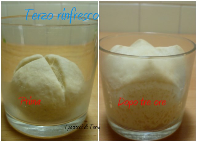 Aspetto il raddoppio a temperatura ambiente. Può volerci anche 5/6 ore per la prima volta e rinfresco di nuovo, riportando le proporzioni di acqua e farina, gradatamente, ai livelli classici