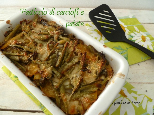 Che io amo le verdure, è un dato di fatto che tutti ormai sanno. Che mischio sempre verdure, unendo magari anche formaggi o uova, anche questo è risaputo. Tutto per evitare di mangiare carne, che comunque nella scala degli alimenti che preferisco, è giusto all’ultimo posto. Ecco che quindi avevo questi carciofi, dal gambo lunghissimo, che io utilizzo tranquillamente in tutte le mie preparazioni. Ci ho messo insieme delle patate, della mozzarella, avanzata dalla pizza del fine settimana, del grana … e voilà; un piatto semplice e goloso che ha fatto dire a mio marito, mangiando la porzione avanzata, il giorno dopo: Sai che è ancora più buono oggi di ieri? E son soddisfazioni! Se vuoi prepararlo eccoti la ricetta del Pasticcio di carciofi e patate.