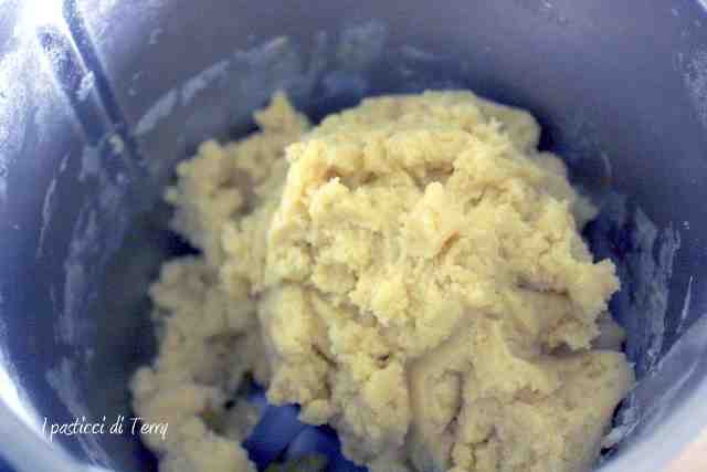Come ho detto impasto semplicissimo, io ho messo tutto nel boccale del bimby ma potete fare con una impastatrice o anche a mano, come volete. Mettere nel boccale del bimby (o dell’impastatrice) farina, zucchero, lievito, uova, il pizzico di sale e l’aroma vaniglia, il burro a pezzetti e impastare 3 minuti, funzione spiga. Aggiungere il latte dal boccale, poco alla volta. Verrà un impasto granuloso ma che appiccica un po’.