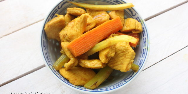 Pollo al curry con carote e sedano in salsa di soia. Eccomi anche questo mese con lo scambio ricette di Bloggalline, che mi vede abbinata al blog di Giuseppina. Dopo aver girato tra le sue pagine, ho scelto di fare questa ricetta, complice anche il fatto che avevo i miei nipoti a pranzo e a loro piace la cucina asiatica, al contrario di mio marito che storce il naso. Però o mangiava o guardava hihhiiiiih. La ricetta è semplice e saporita, basta preparare pollo e verdure a bastoncino e poi si fa tutto nel Wok in pochi minuti. Niente torte mosce per me, nemmeno questo mese.