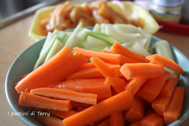 Semplicissimo, fare a bastoncini carote e sedano, dopo averle pulite e mondate. Allo stesso modo fare a bastoncini anche i petti di pollo.