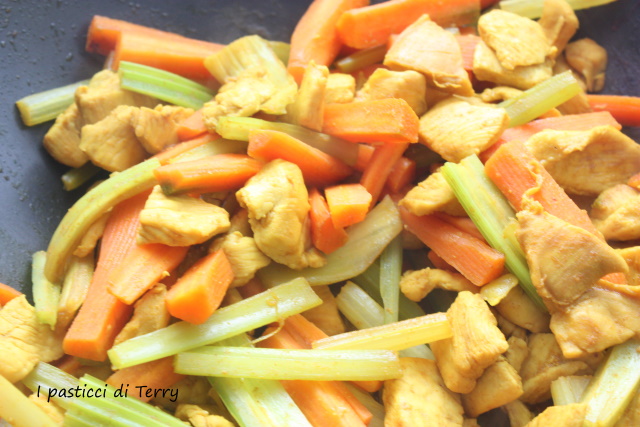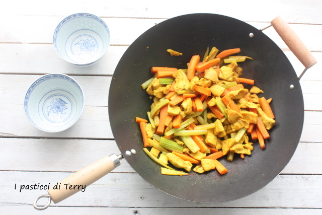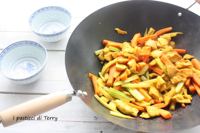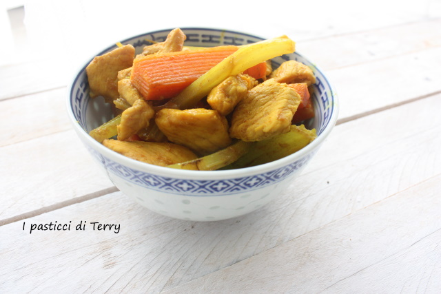 Pollo al curry con carote e sedano in salsa di soia. Eccomi anche questo mese con lo scambio ricette di Bloggalline, che mi vede abbinata al blog di Giuseppina. Dopo aver girato tra le sue pagine, ho scelto di fare questa ricetta, complice anche il fatto che avevo i miei nipoti a pranzo e a loro piace la cucina asiatica, al contrario di mio marito che storce il naso. Però o mangiava o guardava hihhiiiiih. La ricetta è semplice e saporita, basta preparare pollo e verdure a bastoncino e poi si fa tutto nel Wok in pochi minuti. Niente torte mosce per me, nemmeno questo mese.
