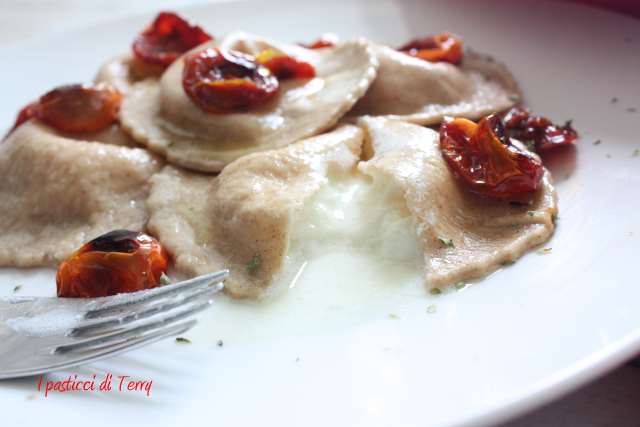 Pasta fresca – Ravioli di grano arso con stracciatella e pomodori confit