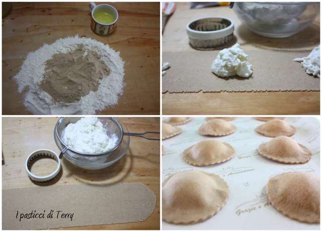 Preparare la pasta impastando insieme gli ingredienti e far riposare. Io ho dovuto aggiungere un paio di cucchiai di acqua. Coprire e tenere coperto al riparo di colpi d’aria, per tutta la durata del confezionamento dei ravioli. Secca molto facilmente.