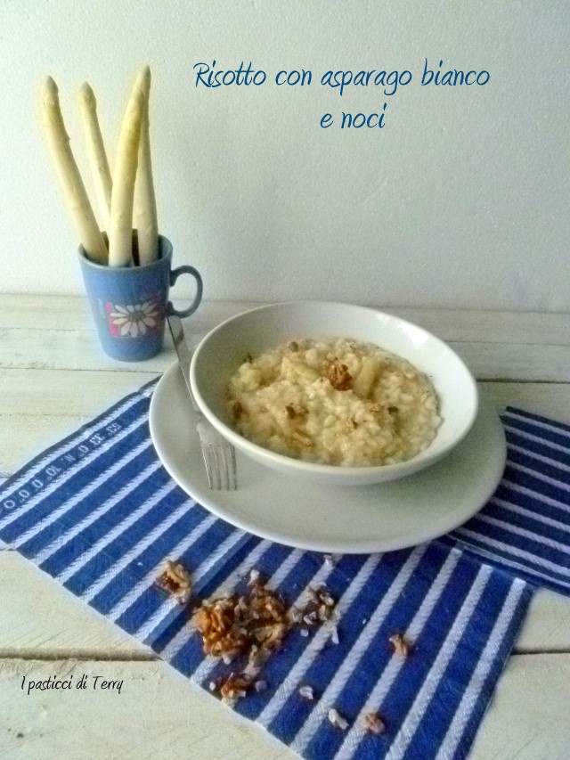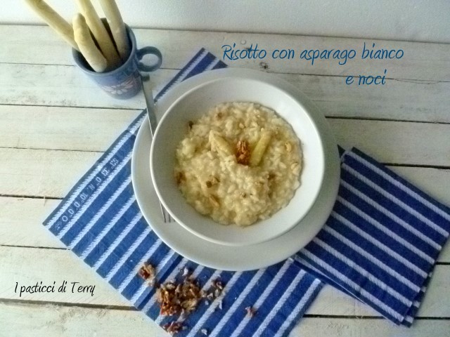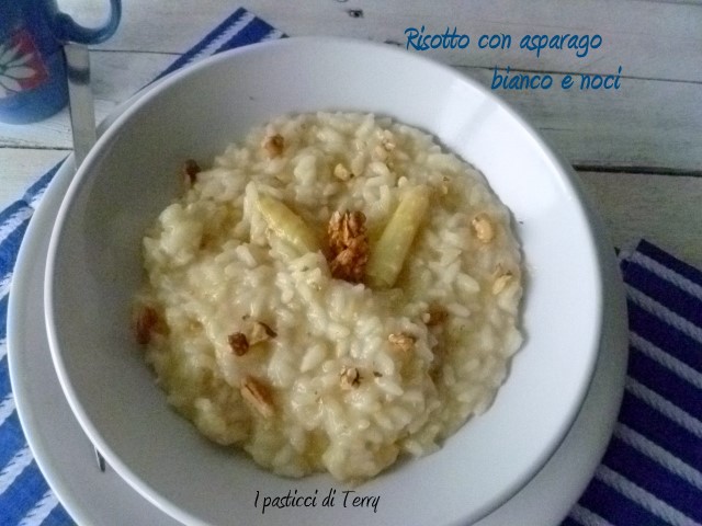 Mi sono anche affrettata a preparare e pubblicare la ricetta perché voglio partecipare al contest di Risate e risotti e mi sembra che questa ricettina sia proprio l’ideale, chissà che il Veneto, con i suoi buonissimi asparagi bianchi, non mi porti fortuna. Per sfumare ho usato del buon prosecco di vino, sempre veneto. Il resto della bottiglia va benissimo per essere gustato insieme al risotto, mangiando. Io per mantecare, oltre alla crema di asparago bianco, ho utilizzato un cucchiaio di robiola. Se non l’avete va benissimo anche della crema di formaggio o della ricotta. Inoltre per servire, direttamente nel piatto, ho distribuito dei gherigli di noce frantumati. A mio parere donano quel croccante che con il morbido del risotto, è la morte sua. Vuoi sapere come l’ho fatto? Ecco qua: Risotto con asparago bianco e noci.