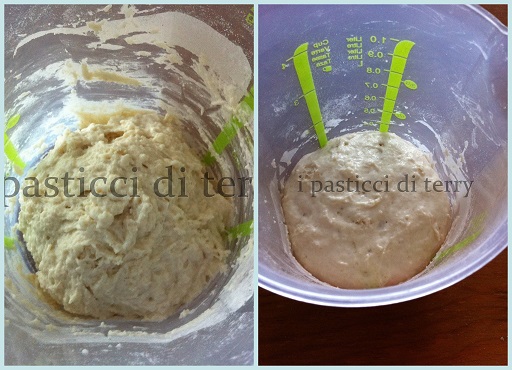 Come avrete notato non ci sono uova in questa ricetta. Io ho fatto l’impasto con il bimby, anche perchè qui non ho ancora una impastatrice. Se voi ce l’avete meglio, oppure potete impastare anche a mano, farete più fatica ma si può fare. Il mio lievitino lo avevo preparato doppio perchè dovevo fare il meraviglioso Pane giallo come il sole. L’ho usato al raddoppio.