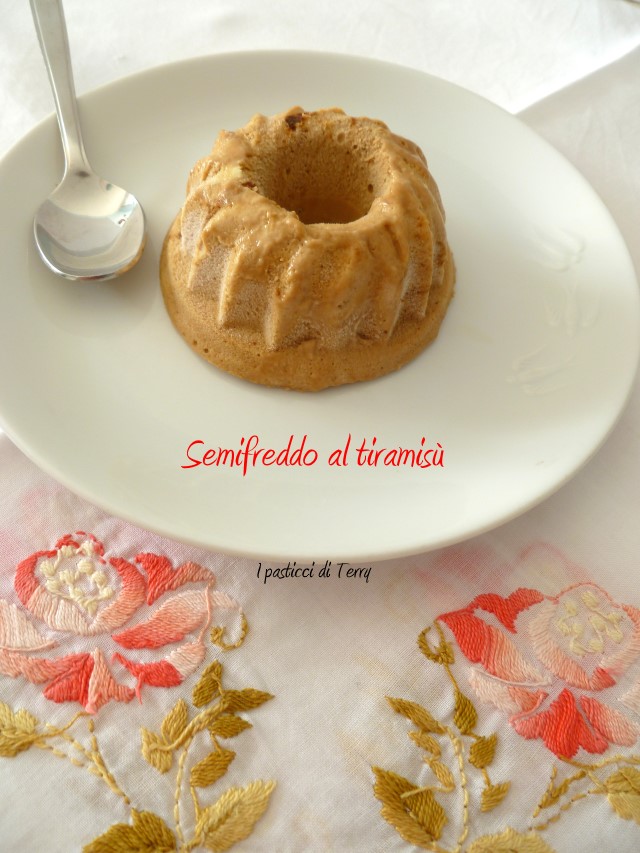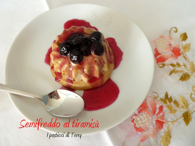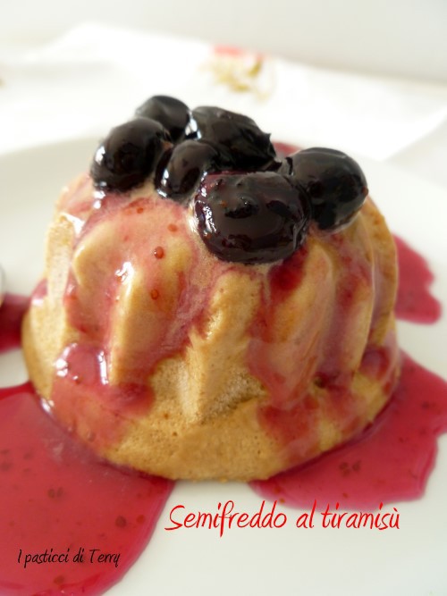 Volevo dire che il dolce preparato oggi, staziona in freezer, dove deve riposare. Spero di finirlo nei prossimi giorni per fartelo vedere e presentare in alternativa a questo, per il giorno di Natale. Questo è un dolcino semplice, con la crema di mascarpone. Il sapore è proprio del celebre Tiramisù, però è più leggero, non avendo i biscotti. Si può servire con della frutta a piacere o anche della salsa di frutta, o una buona Ganache al cioccolato. Io avevo congelato dei frutti di bosco, perciò l’ho decorata con dei mirtilli, passati in padella, con poco zucchero. Puoi prepararlo in anticipo e decorarlo solo all’ultimo minuto, prima di portarlo in tavola. Semifreddo al tiramisù.