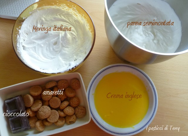 Versare la crema inglese sulla meringa italiana e mescolare con una spatola con movimenti dall’alto verso il basso. Sempre con una spatola e con movimenti dal basso verso l’alto, unire la panna. Da ultimo aggiungere gli amaretti sbriciolati ed il cioccolato fondente a pezzettoni. Versare in uno stampo (se non usate uno stampo in silicone vi consiglio di rivestirlo di pellicola, vi sarà poi più semplice sformarlo) e porre in congelatore. Al momento di portarlo in tavola, sformarlo sul piatto da portata e decorare a piacere.