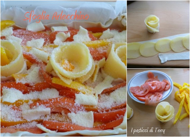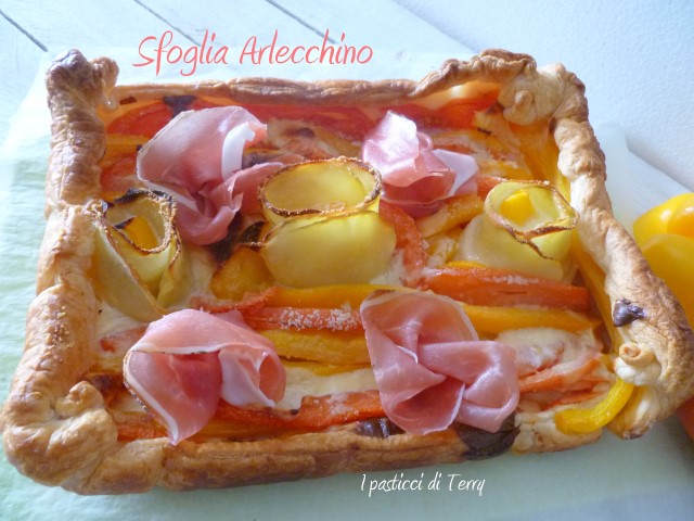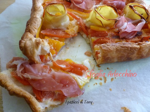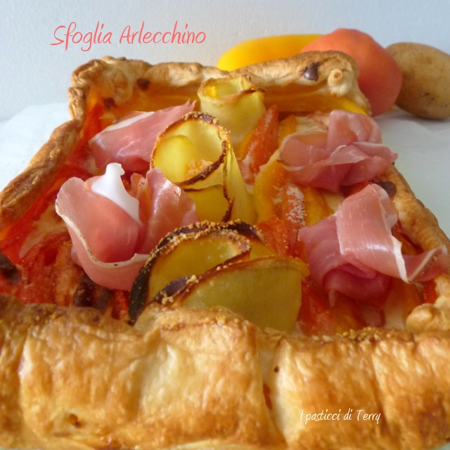 Avevo un peperone giallo, un pomodoro rosso. Avevo del formaggio a fette e via, strada facendo ho “costruito” questa Torta salata. Poi ho immaginato i sapori della patata, peperone, pomodoro e formaggio e mi sono detta che una nota affumicata ci sarebbe stata molto bene e così, una volta sfornata, ho aggiustato delle fette di speck sopra. Il calore delle verdure ha ammorbidito lo speck, che ha rilasciato tutto il suo profumo e il sapore, all’interno della Torta salata. Ti assicuro che questa Sfoglia Arlecchino è golosa e molto profumata. Si farà mangiare senza nessun sacrificio.