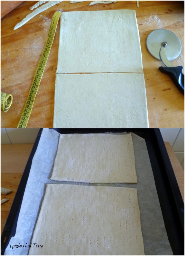 Per la Sfoglia invece, stendere a uno spessore di circa mezzo centimetro, o se usate quella già pronta va bene così. Tagliare in due parti uguali. Bucare con i rebbi di una forchetta. Spennellare con albume e spolverare di zucchero semolato, dopo aver posato le sfoglie su carta forno, direttamente sulla placca.