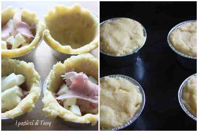 Prendere 4 stampini, tipo quelli usa e getta da muffin, in alluminio. Ungerli leggermente con dell’olio e passare un velo di pan grattato ogni stampino. Foderare base e lati di ogni singolo stampino, con il composto di patate, lasciando l’incavo al centro. Mettere dadini di scamorza e prosciutto cotto a fette, stracciato con le mani. Rivestire con un altro strato di composto di patate.