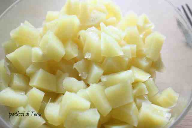 Io ho deciso di cucinare le patate al micro onde. Ultimamente ho come l’impressione che restino più asciutte. Quindi tagliare a tocchetti e metterle in un ciotola con un dito di acqua. Coprire con pellicola e bucherellare con la punta di un coltello. Mettere nel micro onde alla massima potenza per circa 10 minuti. Controllare che siano cotte e lasciar intiepidire.
