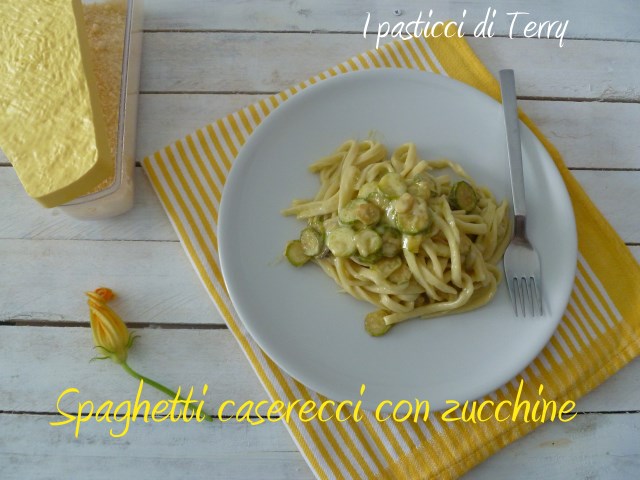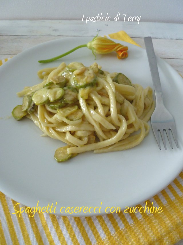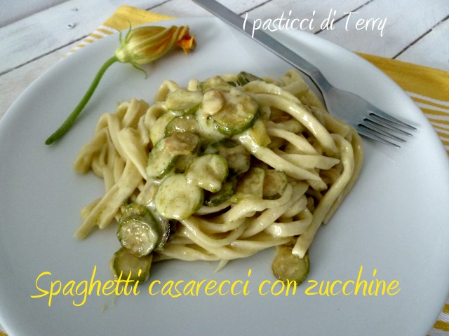 Voglio iniziare la settimana con un buon primo piatto. Fatto con la pasta fresca e con zucchine, rigorosamente bio. Io adoro la pasta fresca, fatta in casa … vivrei di primi piatti e di dolci. Lo so, sono le cose che fanno ingrassare maggiormente ma basta limitare le quantità e ci si salva. La ricetta che vi presento oggi è nata all’ultimo minuto, tempo mezz’ora e avevo il piatto in tavola. Io sono velocissima a impastare, ormai lo faccio da anni e anni. Avevo pensato di fare una carbonara con l’aggiunta di zucchine. Poi ho visto il post della Michela e mi si è accesa la lampadina. In frigo ho ancora quel buonissimo pecorino siciliano, che mi ha portato in dono la mia gemella. Le zucchine sono le mie del balcone, fiori compresi … quindi pronti e via: Spaghetti caserecci con zucchine
