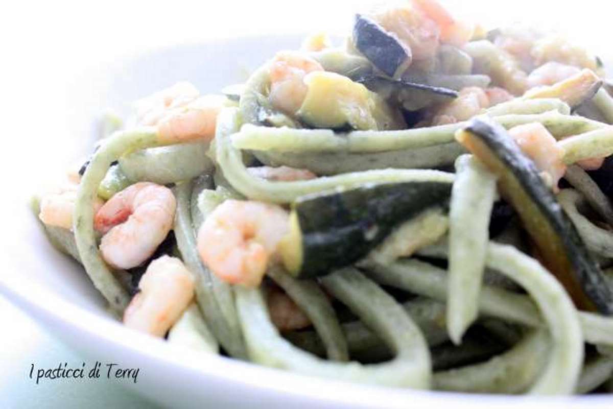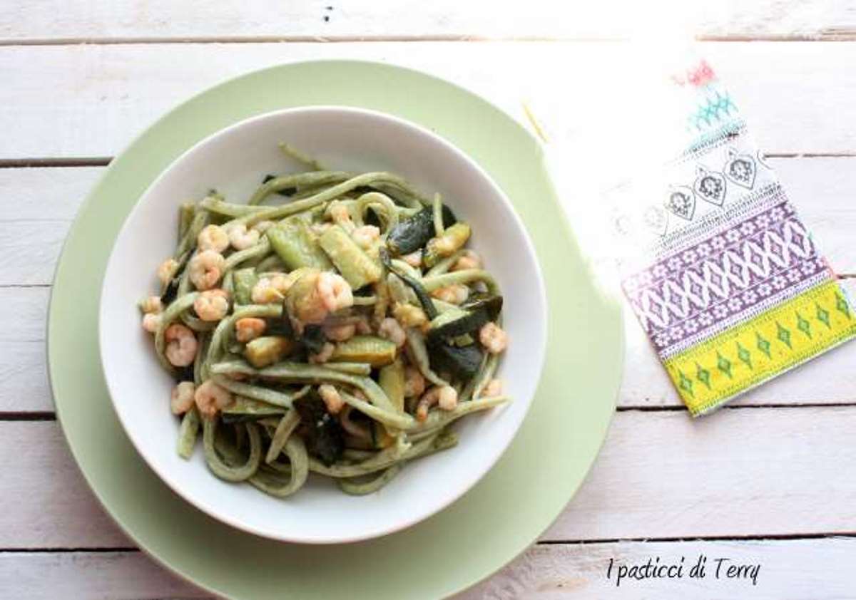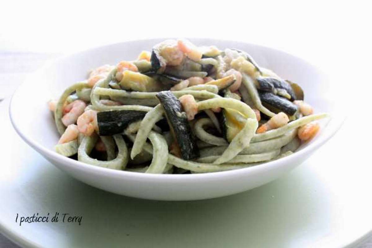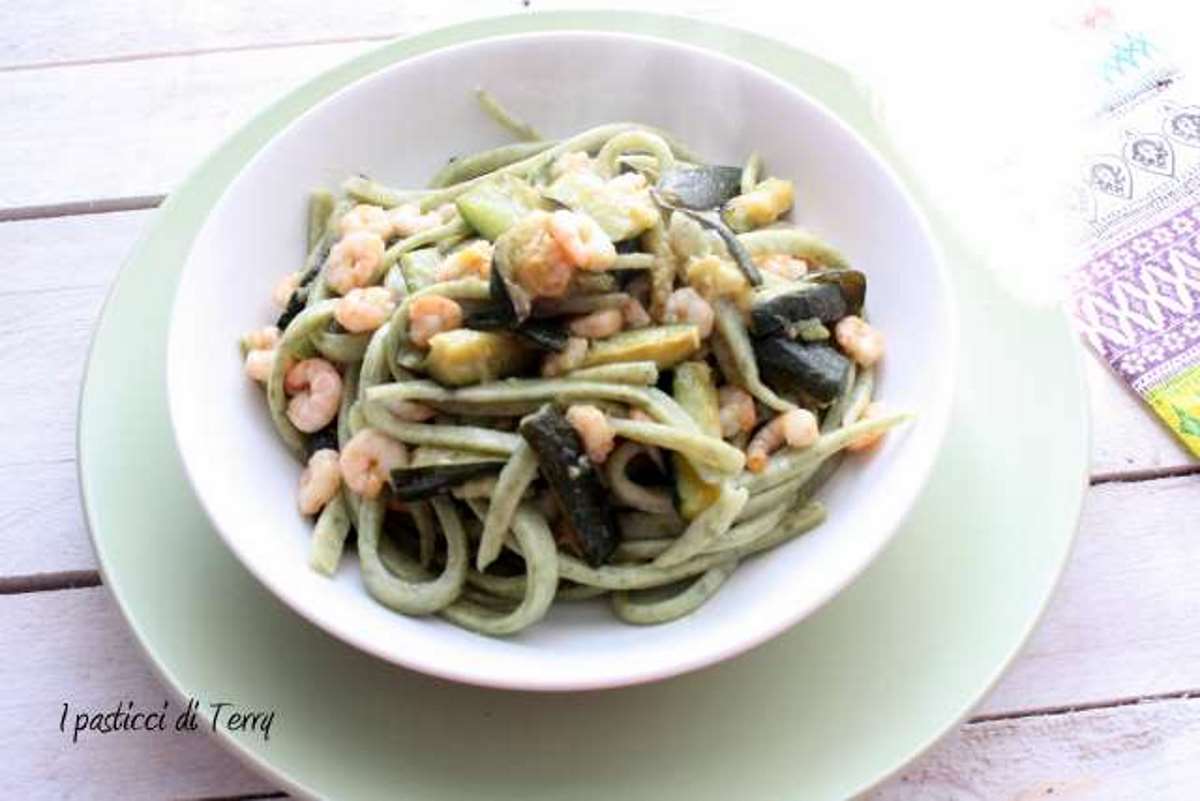 Io per condire ho preparato un classico “Zucchine e gamberetti” ma potete servirli anche con delle vongole e un buon sugo di cozze. Qua spazio alla vostra fantasia. Spaghettoni quadrati con alghe in fiocchi.