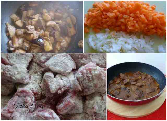 Far dorare in un giro di olio, in una padella a misura, cioè non troppo grossa, rispetto al volume della carne e funghi. Dopo aver dorato il soffritto, aggiungere la carne, scrollata dalla farina in eccesso. Far saltare dorando da tutti i lati. Sfumare con mezzo bicchiere di vino bianco. Una volta evaporato l’alcol, aggiungere mezzo bicchiere di brodo, preparato con il dado vegetale. Il cucchiaino di concentrato di pomodoro, girare, coprire e cuocere per circa un ora.