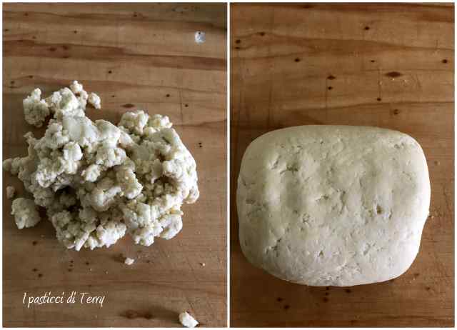 Qui non posso essere precisa, dipende molto dal grado di assorbimento della farina e dall’umidità nell’aria. Dovrete ottenere un impasto granuloso. Togliere dal boccale e compattare, formando un panetto. Avvolgerlo in pellicola e mettere in frigo.
