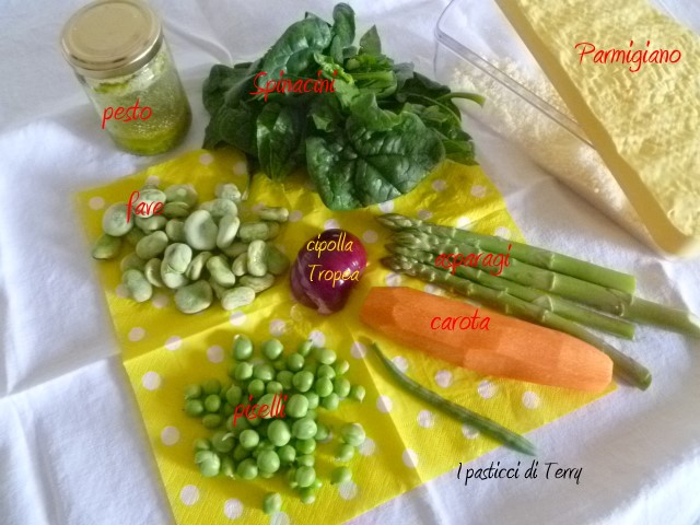 Mettere un bicchiere di acqua a bollire in un pentolino, scottare le fave (le mie erano surgelate, le ultime) per qualche minuto, scolarle, senza buttare l’acqua (metterla in un’altra pentolina e poi travasarla di nuovo). Togliere la pelle alle fave. Nella stessa acqua, rimessa nella pentolina, mettere gli asparagi (escluso le punte) fatti a pezzi e i piselli. Farle cuocere per circa cinque minuti. Scolarle, sempre senza buttare l’acqua, tenerla da parte che può servire per cuocere il ragù di verdura. In una larga padella, mettere la cipollina di Tropea e la carota a pezzetti con un giro di olio evo. Far appassire. Aggiungere tutte le verdure, salare e far cuocere per circa 10/15 minuti, coperto. Se serve aggiungere l’acqua tenuta da parte.