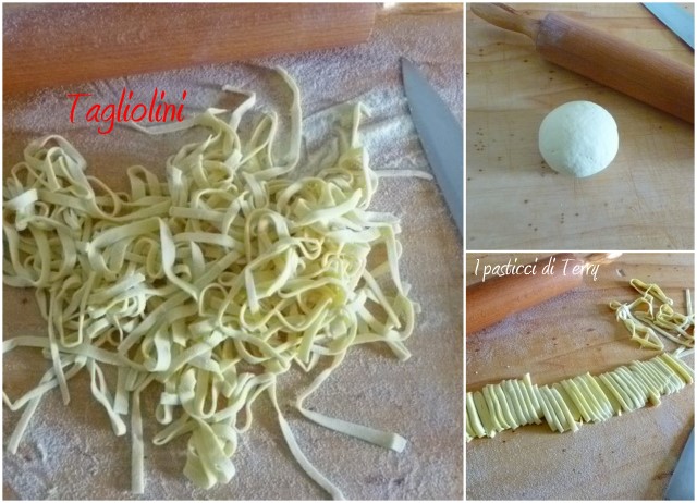 Prima di tutto preparare i Tagliolini, impastando tutto insieme. Formare un panetto, coprire e lasciar riposare per circa dieci minuti. (intanto pulire le verdure). Tirare una sfoglia sottile, io ho fatto con il mattarello ma si può usare anche la famosa nonna papera. Spolverare bene con la semola, piegare e tagliare i Tagliolini, facendoli grandi come volete.