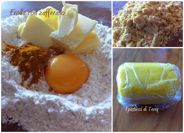 Preparare la frolla allo zafferano mischiando velocemente gli ingredienti. Avvolgere il panetto in pellicola e metterlo in frigo per almeno 30 minuti.