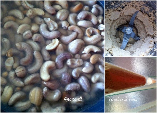 Dopo che gli anacardi sono raddoppiati, scolarli dall’acqua, metterli in un mixer o in un robot da cucina. Aggiungere il succo di limone e il sale e cominciare a far girare per tritare il tutto. Controllare, assaggiare e aggiustare di sale. Volendo ci sta bene del pepe e delle erbe aromatiche, tipo salvia, rosmarino o altro. Una volta pronto il formaggio sistemarlo in una sac-a-poche e posizionarlo in frigo.