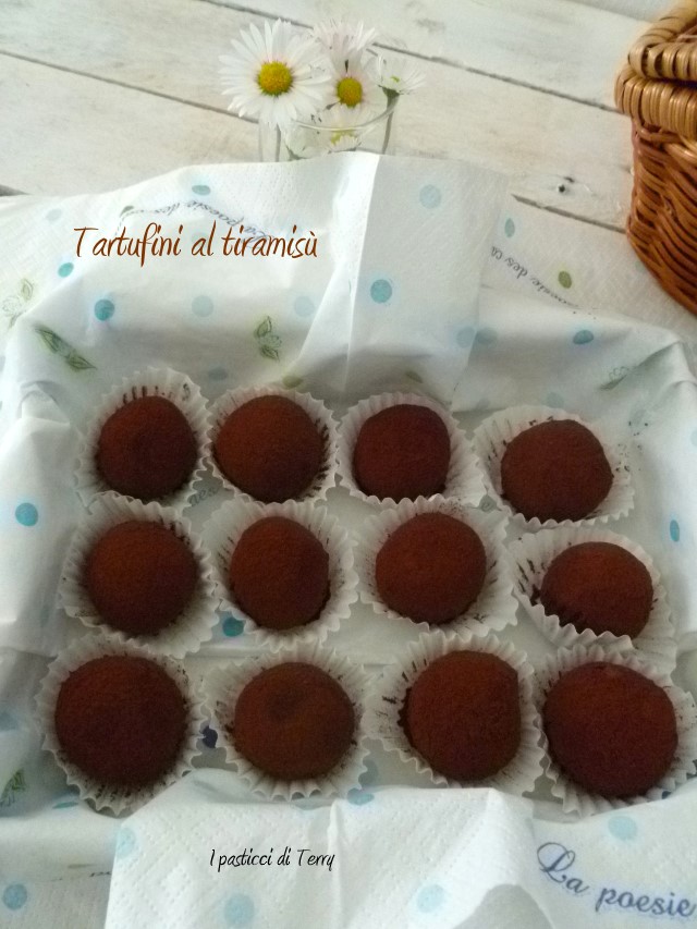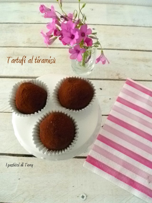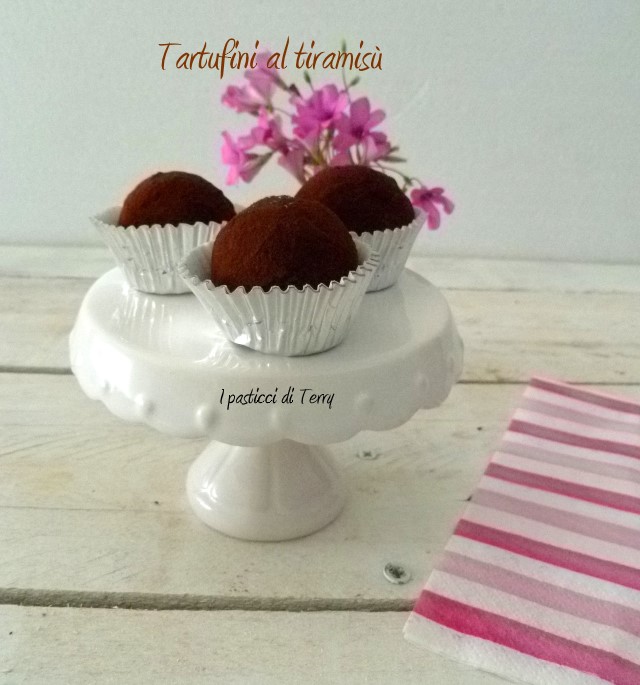 Sono di una semplicità estrema, si prepara l’impasto, si lascia freddare per bene, si formano i tartufini e si rotolano nel cacao, punto. Io li ho preparati un giorno per l’altro perché è bene che siano freddi. Li ho consigliati alla mia gemella che manco a dirlo, è andata subito a comprare gli ingredienti e li ha fatti al volo anche lei. Io li ho portati a pranzo da mia cognata e abbiamo gradito tutti. L’unico consiglio; fatene doppia dose perché vanno a ruba. Grazie ragazze del condominio, in particola a Tam per avermi fatto core questa ricettina sprint e buonissima. Tartufini al tiramisù