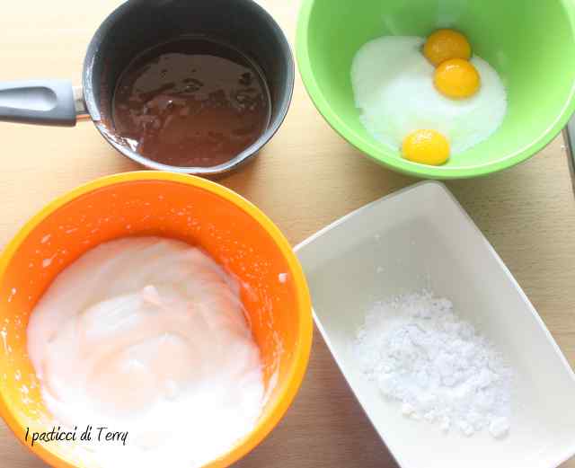 Mettere il burro e il cioccolato a pezzi, in una pentolina. Mettere su fiamma bassa e far fondere dolcemente. Far intiepidire. Separare gli albumi dai tuorli. Montare gli albumi con un pizzico di sale.