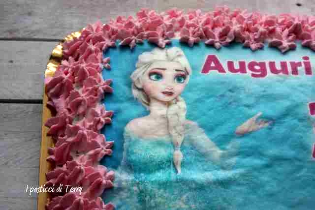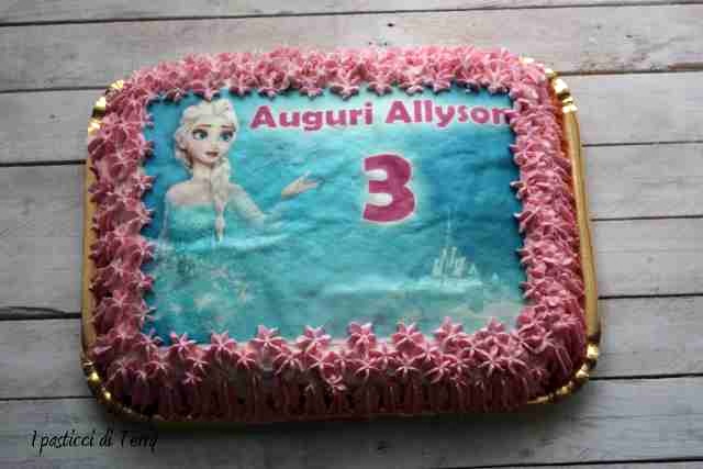 Torta compleanno Allyson. E dopo la torta del mio Christian oggi vi presento un altro dolce, come vi avevo annunciato. In occasione della festa di compleanno della nipotina di mia sorella, ho preparato questa torta. Un dolce semplicissimo, non ho voluto fare niente di complicato, visto che era per dei bambini piccoli. Ho preparato una base di simil pan di spagna al cacao, non troppo alto. L’ho farcito di Camy cream e decorato con una cialda già pronta di Elsa di Frozen (sua passione) e ciuffi di panna colorata di rosa. Naturalmente ho usato dei colori vegetali, dosando il rosso, fino a ottenere il rosa desiderato.