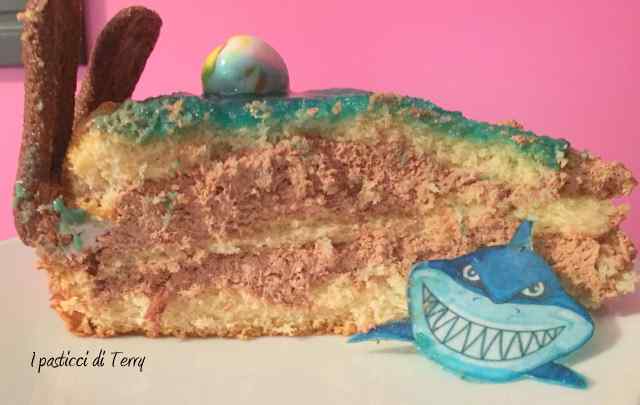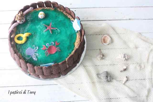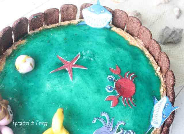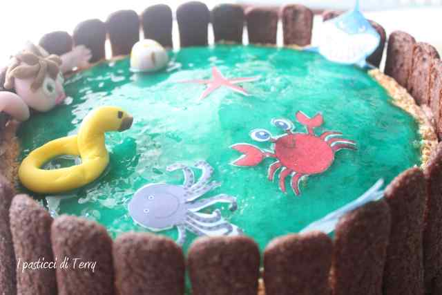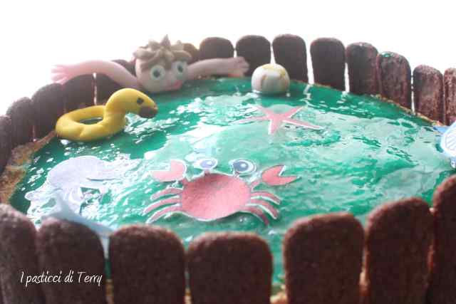 La copertura è fatta con Gelatina di albicocche colorata con del blu vegetale. La staccionata è formata da Pavesini al cacao. Il bimbo, la palla e il salvagente, li ho preparati con la pasta di zucchero, mentre gli animali (polpo, squalo e stella marina) sono fatti di ostia alimentare.