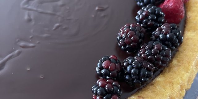 Secondo me ci sta bene anche una bagna semplice, anche con acqua e zucchero per inumidire la base. La prossima volta la farò. Questa volta non l’ho messa e quindi ho versato la ganache sulla torta rovesciata. Farcire a piacere con dei frutti di bosco ma anche con delle piccole meringhe o senza niente va bene lo stesso.