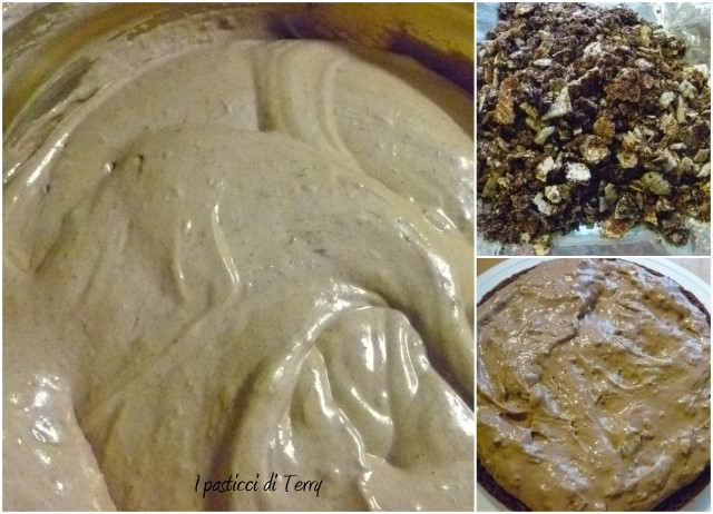 Mentre la torta raffredda, preparare la farcia: Montare leggermente la panna, unire la crema di nocciole e le briciole dei wafer. Girare bene e mettere in frigo, fino al momento di assemblare il dolce.