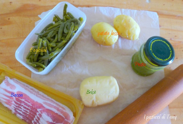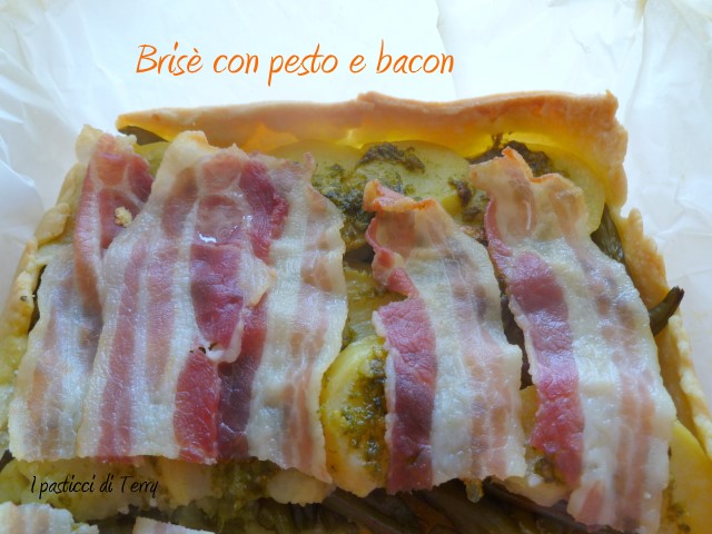 Brisè con pesto e bacon. Questa è una delle tante ricette che preparo per svuotare il frigo. Aggiungo e tolgo a seconda del momento. Questa volta avevo dei fagiolini, già lessati, che mi erano avanzati. Ho lessato anche due patate lesse. Il pesto fatto fresco, regalo delle mie piantine di basilico sul balcone.