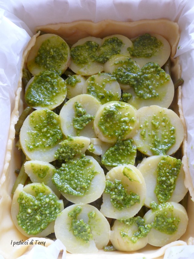 Stendere la brisè (o se usate quella pronta, prepararla nella teglia che andrete a usare) direttamente sulla carta forno e sistemarla nella teglia scelta. Bucherellarla con una forchetta. Sopra stendere i fagiolini lessi, le patate e sopra ancora il pesto.
