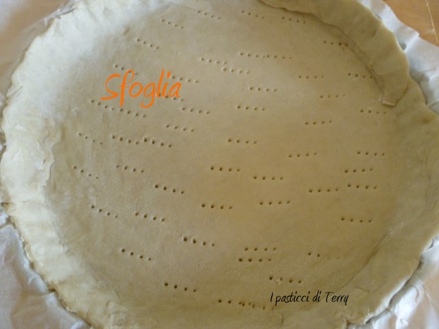Stendere la pasta sfoglia, della forma della teglia che avete scelto, sopra della carta forno. La mia era rotonda da 26. Alzare i bordi e bucherellarla con una forchetta. Mettere in frigo, fino al momento di riempirla.