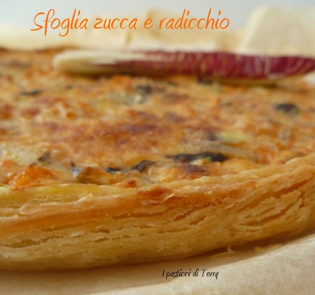 Oggi voglio lasciarti una ricetta molto gustosa, una Torta salata veloce e che si può anche preparare in anticipo e cuocere all’ultimo minuto. Io ho usato la mia Pasta sfoglia, che tengo sempre di scorta in freezer ma puoi anche usare la sfoglia in commercio. Oppure anche una brisè, più leggera. Se poi la vuoi più “dietetica” puoi farla con una Pasta al vino. A me comunque piace così, bella “burrosa”. Il ripieno è di stagione: della buona zucca e del radicchio trevisano, quello lungo. La trevisana spezza il dolce della zucca, creando un giusto contrasto. Per rendere tutto più cremoso e filante ho aggiunto della ricotta e della mozzarella ma puoi usare anche del gorgonzola, che ci sta benissimo come gusto. Se usi una Pasta al vino può essere adatta anche ai vegetariani. Ecco qua la mia Sfoglia di zucca e radicchio.