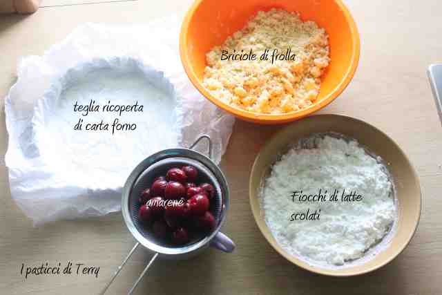 Semplicissima, basta impastare con le mani tutti gli ingredienti in una ciotola, dopo aver tagliato il burro a pezzetti, fino ad ottenere un impasto che si sbriciola fra le mani.  Foderare la teglia con della carta forno, bagnata e strizzata. Sistemare più della metà delle briciole di frolla, sopra mettere i fiocchi di latte e sopra ancora le amarene, sgocciolate dal loro liquido.