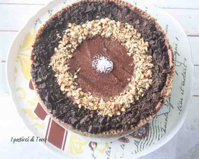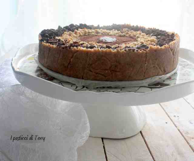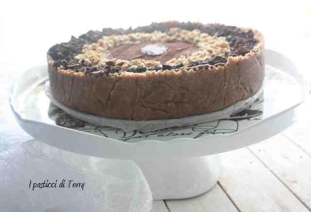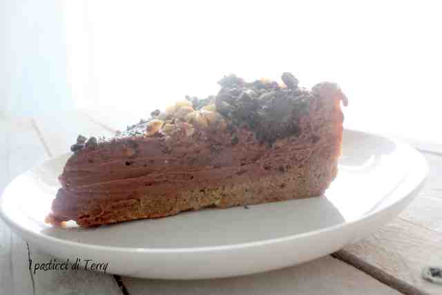 Spero si veda dalla fetta quanto è golosa; la morbidezza della crema in mezzo allo strato base di biscotti e le granelle di nocciole e di cioccolato sulla sommità della torta.