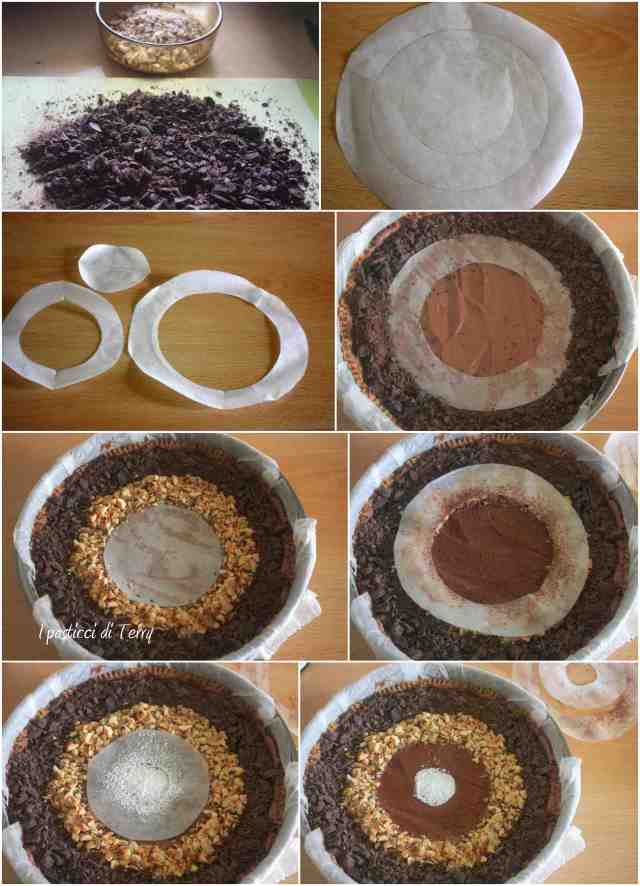 Ridurre a coltello prima le nocciole tostate e poi il cioccolato, tenendo separato i due ingredienti. Tagliare con la carta forno un cerchio, delle stesse dimensioni del vostro stampo. All’interno fare un altro cerchio, magari usando uno stampo da 18. E all’interno ancora una tazza o qualcosa di tondo ancora più piccolo. Tagliare a cerchi la carta forno, seguendo le tracce.