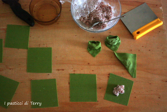 Preparare la pasta fresca verde agli spinaci, come spiegato in questa ricetta. Preparare il ripieno tritando fine il culatello, unire la robiola, fino a ottenere un composto liscio e omogeneo. Stendere la pasta, aiutandovi con la nonna Papera o a mano, se siete bravi. Tagliare dei quadrati, mettere un cucchiaino di ripieno, ogni quadratino e chiudere, prima a triangolo e poi unire i lati, come in foto.
