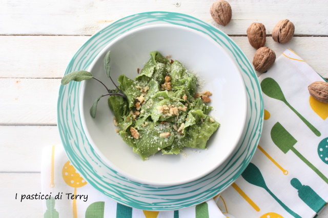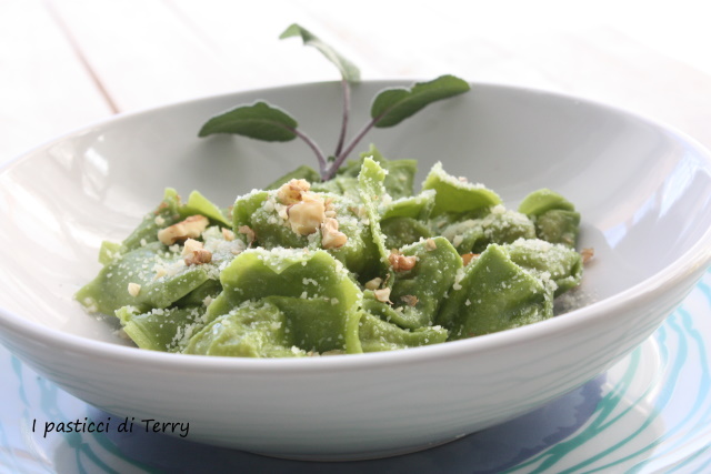 Il condimento è un semplice burro e salvia, arricchito da qualche gheriglio di noce frantumata a mano, per dare croccantezza al piatto. E se volete sopra una spolverata di parmigiano. Tortelloni verdi con robiola e culatello.